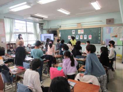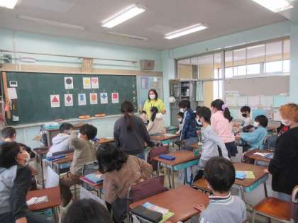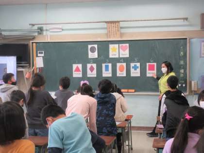 3年生の英語活動の学習です。いろいろな形の言い方を練習しています。