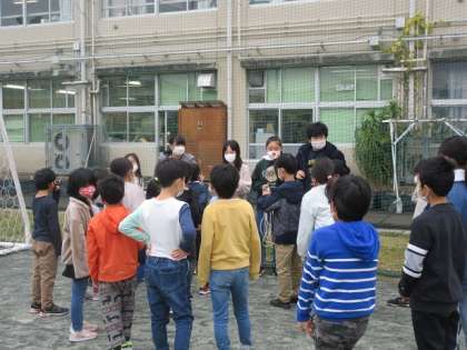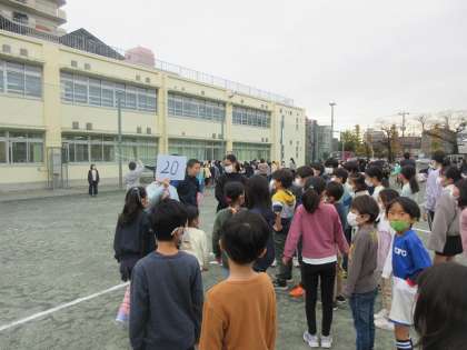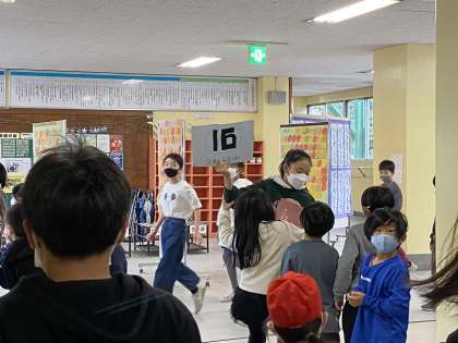 6年生が数字のカードを持って立っち、出てくる1年生を迎えていました。