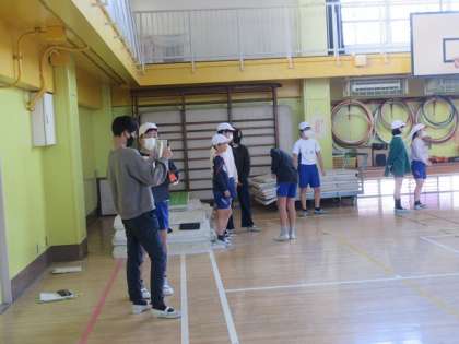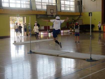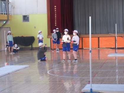 走り高跳びの練習をしています。友達に試技をしている様子をタブレットで撮影してもらい、後で確認します。