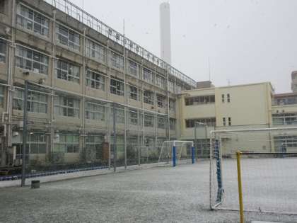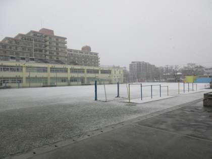 朝からの天気予報通り、昼前からの雪で、校庭は雪化粧となりました。