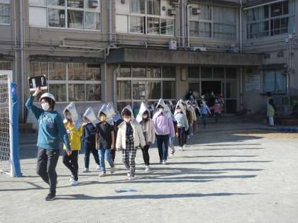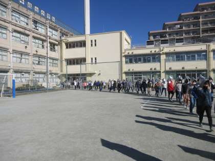 今日の避難訓練の想定は、休み時間に地震発生です。