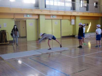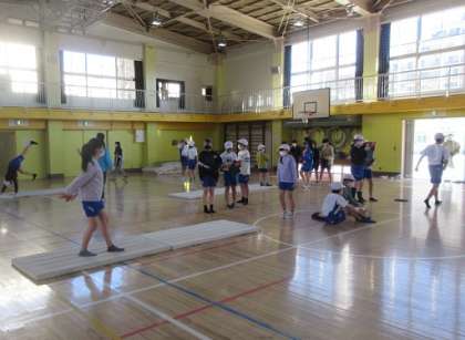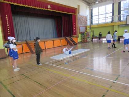 6年2組の体育館でのマット運動の学習です。