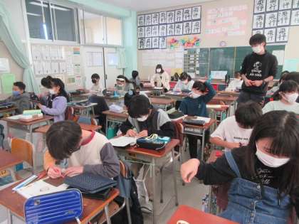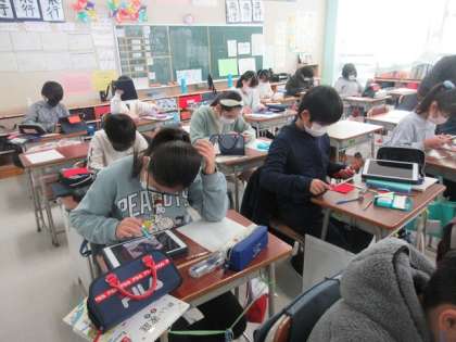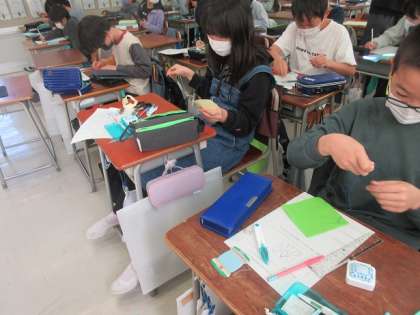 フェルトを材料にコースターづくりです。丁寧な作業をテーマに、手縫い模様の作成です。