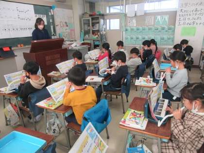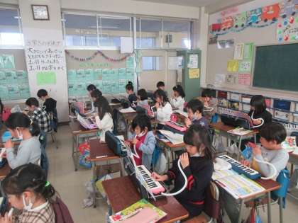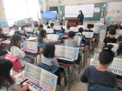 1年生の音楽で鍵盤ハーモニカの合奏をしています。