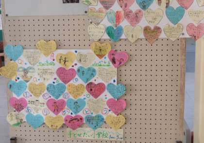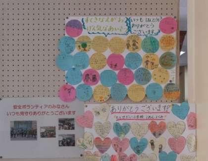 1年生の子ども達が、毎日見送ってくださる安全ボランティアの皆さんへのお礼のメッセージが掲示されています。
