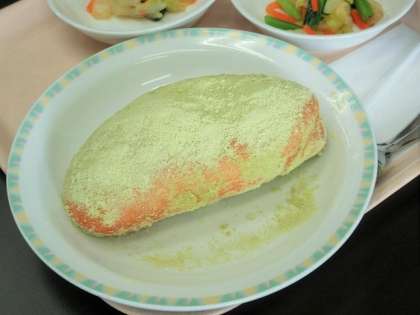 今日の給食のうぐいすあげぱんと名の通り、薄緑色の粉がまぶしてあります。