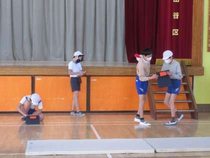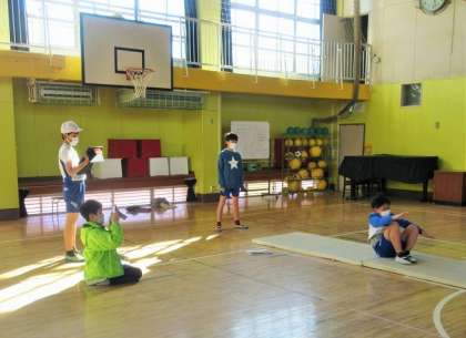 6年1組の体育学習です。ここのところ、6年生のマット運動の学習に入っています。
