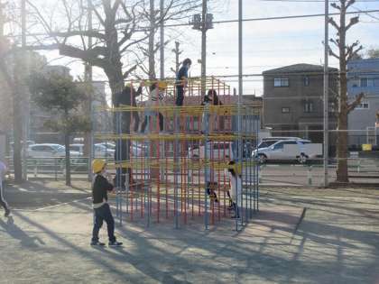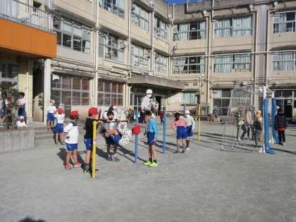 鉄棒やジャングルジム、ボール、鬼遊び、元気いっぱいに体を動かしています。