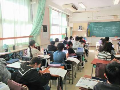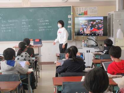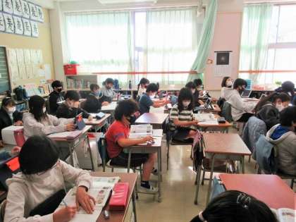家庭でオンラインしている子ども達に、教室に様子を配信しながらの授業です。