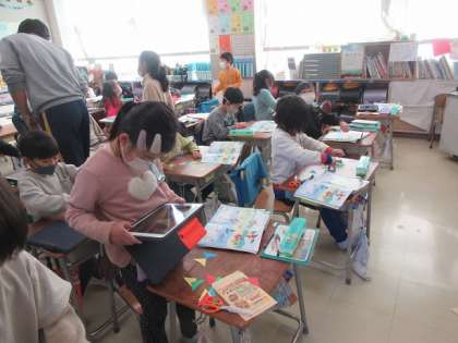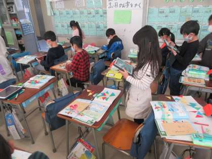 1年生の算数学習です。三角に切られた、様々な色画用紙をならべて、形を作ります。