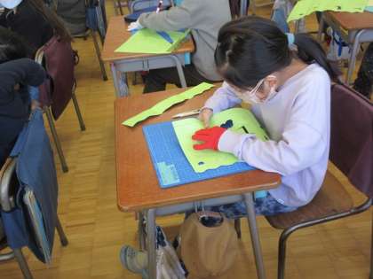 2年1組ではカッターナイフを使っての作業です。