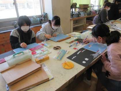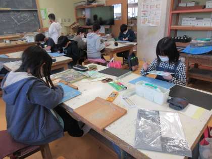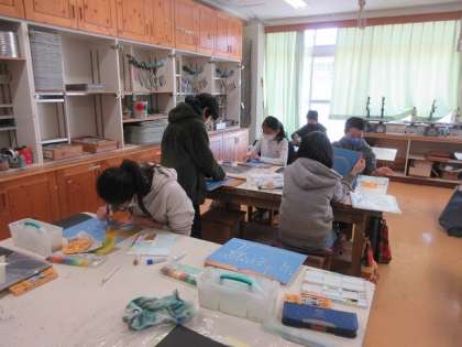 絵の具を使い、黒い画用紙で、多色刷りの版画になるようです。