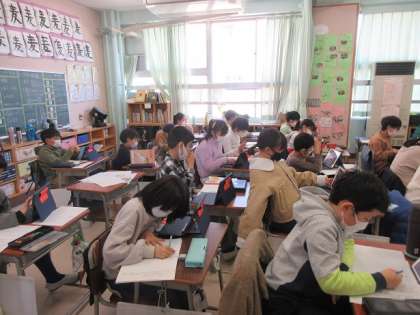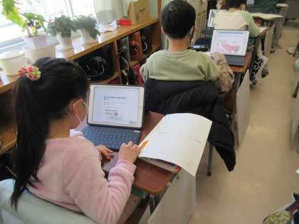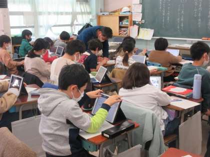 意見の根拠となりそうなことを、タブレットを使って確認している子もいます。