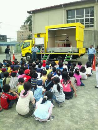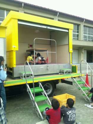 4人ずつ車に乗って、大きな揺れからどう自分の体を守るかを学びました。