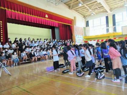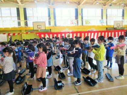 先日の6年生を送る会に参加のできなかった1年生が、6年生の卒業を祝い、合奏と歌の贈り物しました。