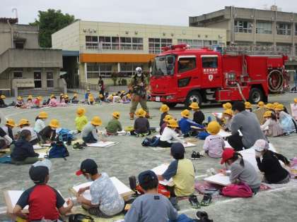 消防服を着た消防士や消防車を囲み、絵をかきました。