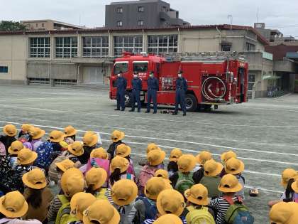 校庭に消防車が来て、よく見ながら大きな画用紙いっぱいに絵を描きました。