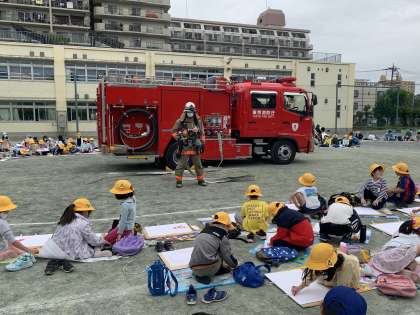 消防士さんが身につけている道具や、消防車にある器具にも興味をもって質問しながら取り組みました。