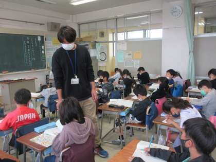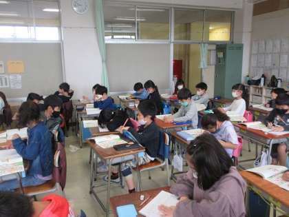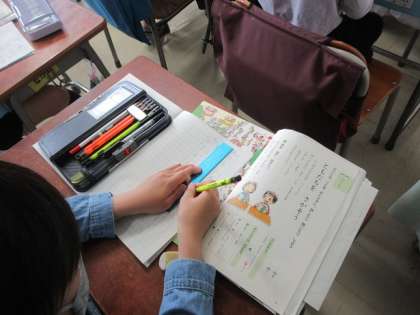 教科書の挿絵を見ながら、描かれている人物を友達に紹介するようです。