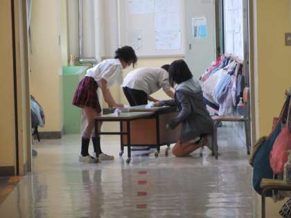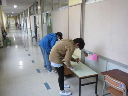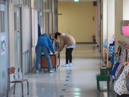 各教室の配膳台をきれいしている給食委員会の子ども達です。
