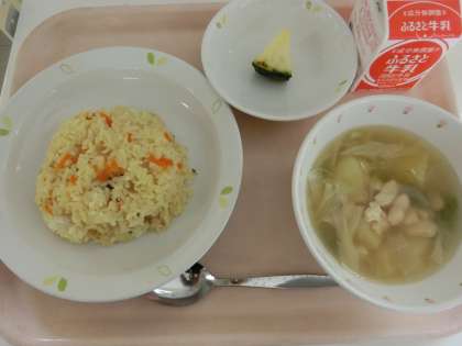 今日は連休明けの心と体に、ガツンと食欲と元気が出るようにと考えた献立です。ポークガーリックライスは食べると肉や野菜のうまみと一緒ににんにくの香りが広がり、どんどん食べられます。隠し味のバターのおかげで後味もまろやかになっていました。例年この時期はもう暑いからと思って果物はパイナップルにしましたが、今日は肌寒い一日でした…。季節の変わり目は気温の予想が難しいですね。ですが、パンチの強いごはんのデザートにはぴったりでした!