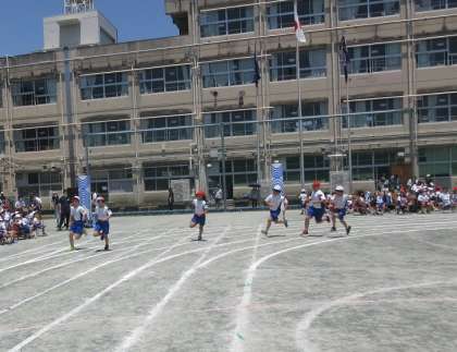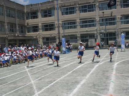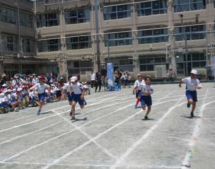 千歳台の短距離走のコースの特徴は、カーブを抜けた後にも距離が残っているところです。カーブを立ち上がってからの迫力は高学年ならではです。