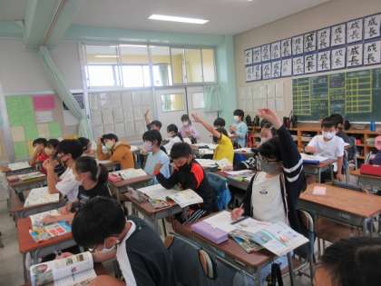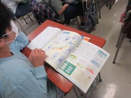 「日本の国土の特色」というテーマで、これまでの学習をもとに考えを出しています。