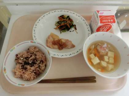 千歳台小学校の開校をお祝いする給食です。お赤飯は、給食室で小豆を煮るところから作り、お米に小豆と煮汁を炊き込んで色を付けています。炊けた後に天地を返す過程で、どうしても小豆の皮がやぶけてしまうのが、大量調理の難しいところです。すまし汁には、「祝」と書かれたなるとが入っています。普段の給食では出てこない、ちょっと変わった食材に子どもたちは驚いていました。