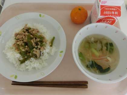 少し濃く味付けしたチンジャオロースを、ごはんにのせて丼物にしました。およそ30kgのピーマンを使っています。ピーマンは、意外と多くの児童が食べられる野菜ですが、苦手な子はやっぱり苦手です。「今日ごはんしかたべられないじゃん!」という頑なな子にも、一口、場合によっては細切りの一本は食べようと声をかけました。そんな中、「ピーマンあんまり好きじゃないんだけど、今日はおいしいかった」とお皿を空っぽにしている子もいました。クラスのみんなと食べる給食は、ちょっと特別なのかもしれませんね!