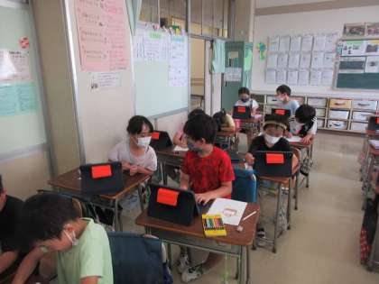 午前中に行ってきた「まちたんけん」のまとめをしています。