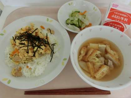 今日は一日晴れやかで、絶好のプール日和ですね。プールから帰ってきた子どもたちは「お腹すいた〜」「楽しかったけど疲れたよ」と口々に話してくれます。たくさん運動して体が疲れているから、給食を食べて元気になって帰ろうね、と伝えました。だしや食材のうまみがしみた親子丼は、どのクラスでも大人気でした。