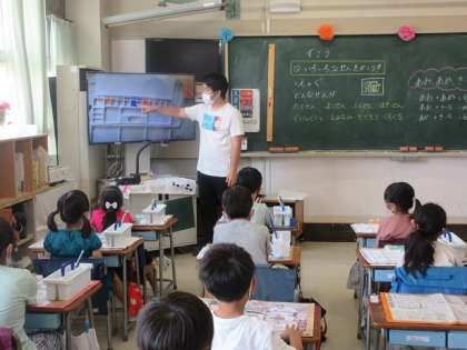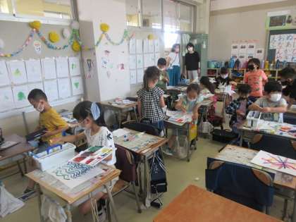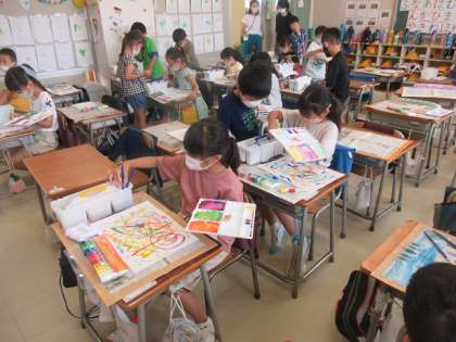 絵の具を使って、いろいろ色で、たくさん線を描いています。