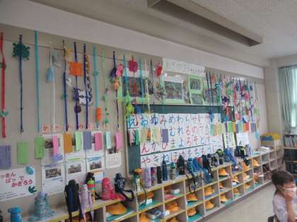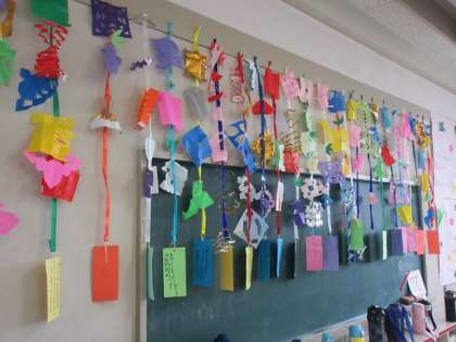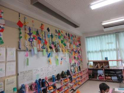 1年生の教室の後方には、七夕飾りと短冊が下がっています。