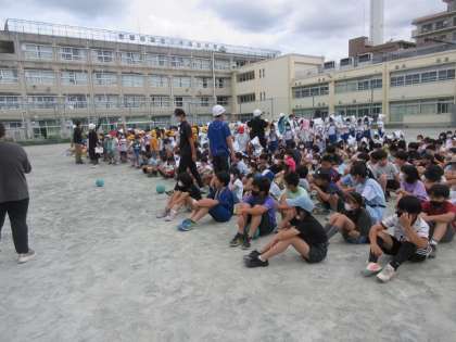 始まりの合図のサイレンが鳴ると、一斉に遊びをやめ、放送に耳を傾けています。