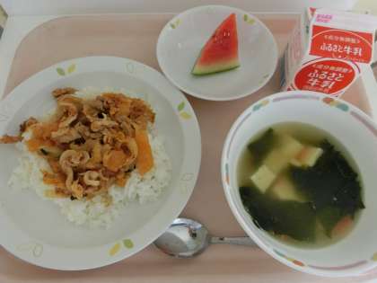 人気の定番おかず、豚キムチをごはんにのせました。キムチは2/3をよく水洗いして、辛みを流して調整します。それでも出来上がると、後からじわじわやってくる辛みが食欲をそそる仕上がりに。子どもたちは「ちょっと辛いけど…気付いたら食べちゃってた!」と“うま辛”を堪能していました。デザートの甘くてみずみずしいスイカも、マッチしていました。