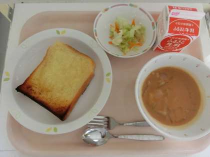 はちみつ、レモン汁、バターを混ぜ合わせて、パンにぬって焼きました。食べると甘さの後に、ほんのり爽やかにレモンが香ります。トマト味のポークシチューも、いつもよりルウの量を減らしてさらっとさせた夏仕様です。