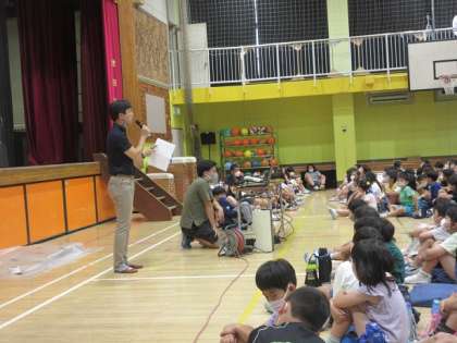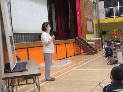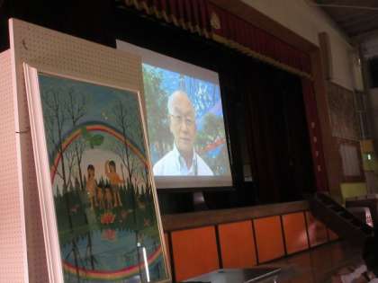 今日の集会には、壁画と壁画前のめばえの碑の作者の谷内六郎先生のご家族の谷内広美さん、同窓会長の倉本さんをお迎えし、ごお話をいただきました。また、開校当時に担任をされていた宇田陽一先生からお手紙をいただいたり、卒業生や旧職員からのビデオメッセージをいただいたりし、壁画の思い出を寄せていただきました。