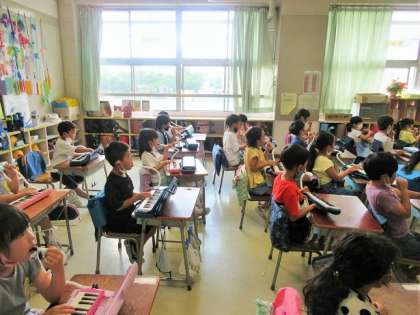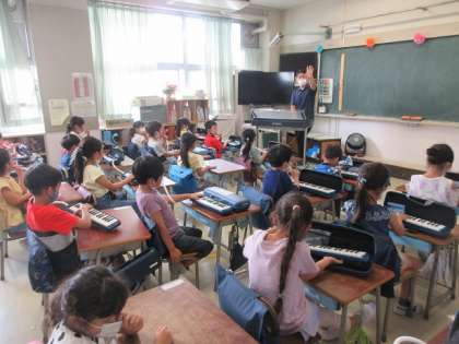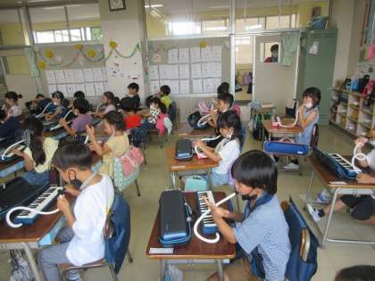 鍵盤ハーモニカを吹いています。先生の伴奏をよく聞いて合わせます。