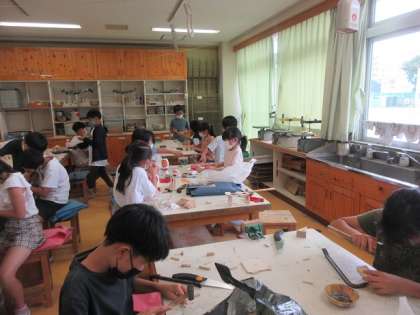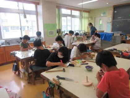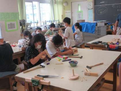 木工作をしています。金づち、のこぎりなどの道具も上手に使っています。