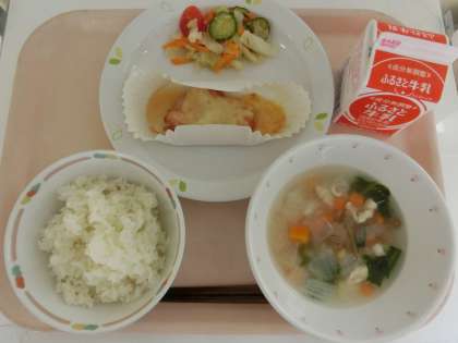 今は2年生がミニトマトを育てているので、ミニトマトを使った料理に興味をもってもらえるように取り入れてみました。2年生は給食をチェックしながら「まだ緑色だよ」「1個だけオレンジになった!」と、日頃の観察の成果を教えてくれました。