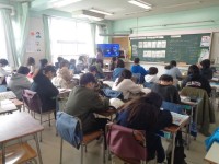 班で行動、走らないなどのルールが工夫されています。ハンター役は千歳台小の先生が4人がお面をかぶっています。