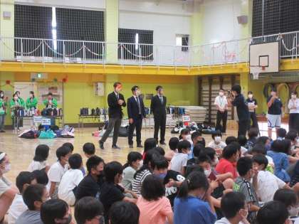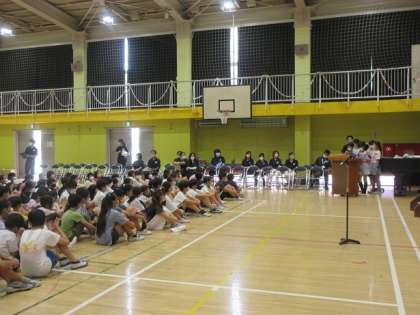 班で行動、走らないなどのルールが工夫されています。ハンター役は千歳台小の先生が4人がお面をかぶっています。