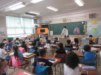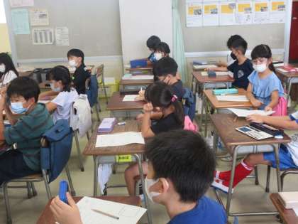 2年2組では、2学期にやる学芸会について、先生の話を聞いていました。