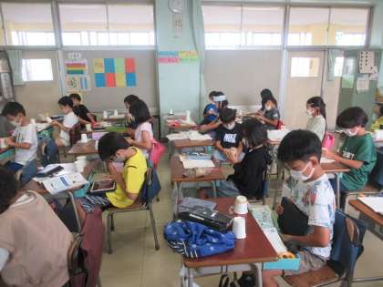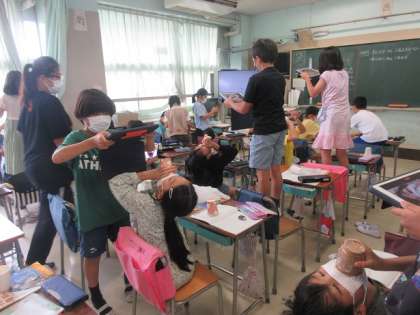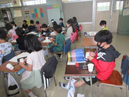 紙コップの底にビーズが入れてあり、声の振動によってどのようになるかを確かめています。タブレットでその様子を確認しています。
