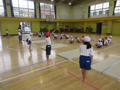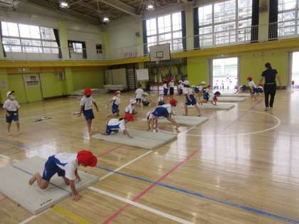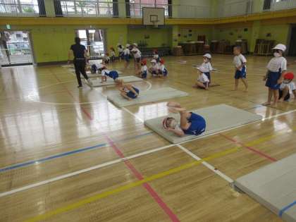 マットの上で転がり遊びです。マット運動遊びの約束を確かめていました。