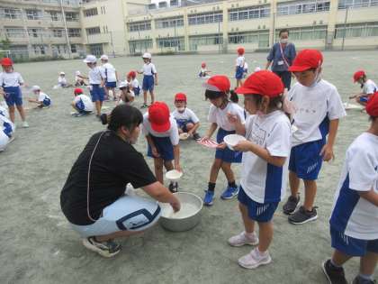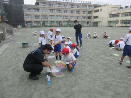 シャボン玉を作っています。上手に作れたかな。