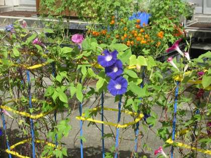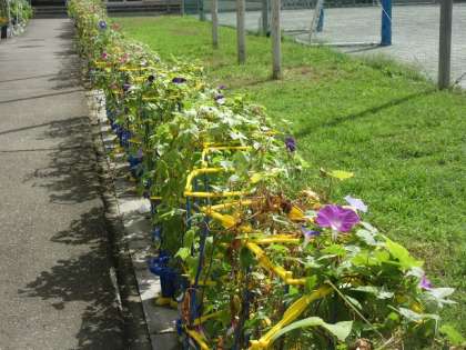 職員室の前に並んだアサガオは、この夏にたくさんの花をつけて事が伝わってきます。