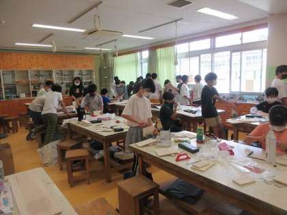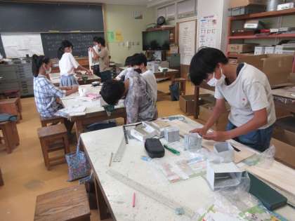 工作用紙で作った模型をもとに、板材を使った木工作です。
