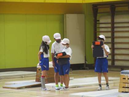 跳び箱運動の学習で、タブレットを使った、自分の試技を再生して確かめます。