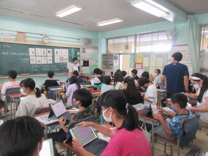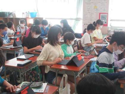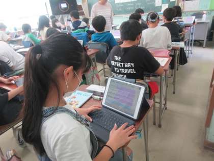 タブレットを使い、基本の分をもとに、紹介分を作成します。